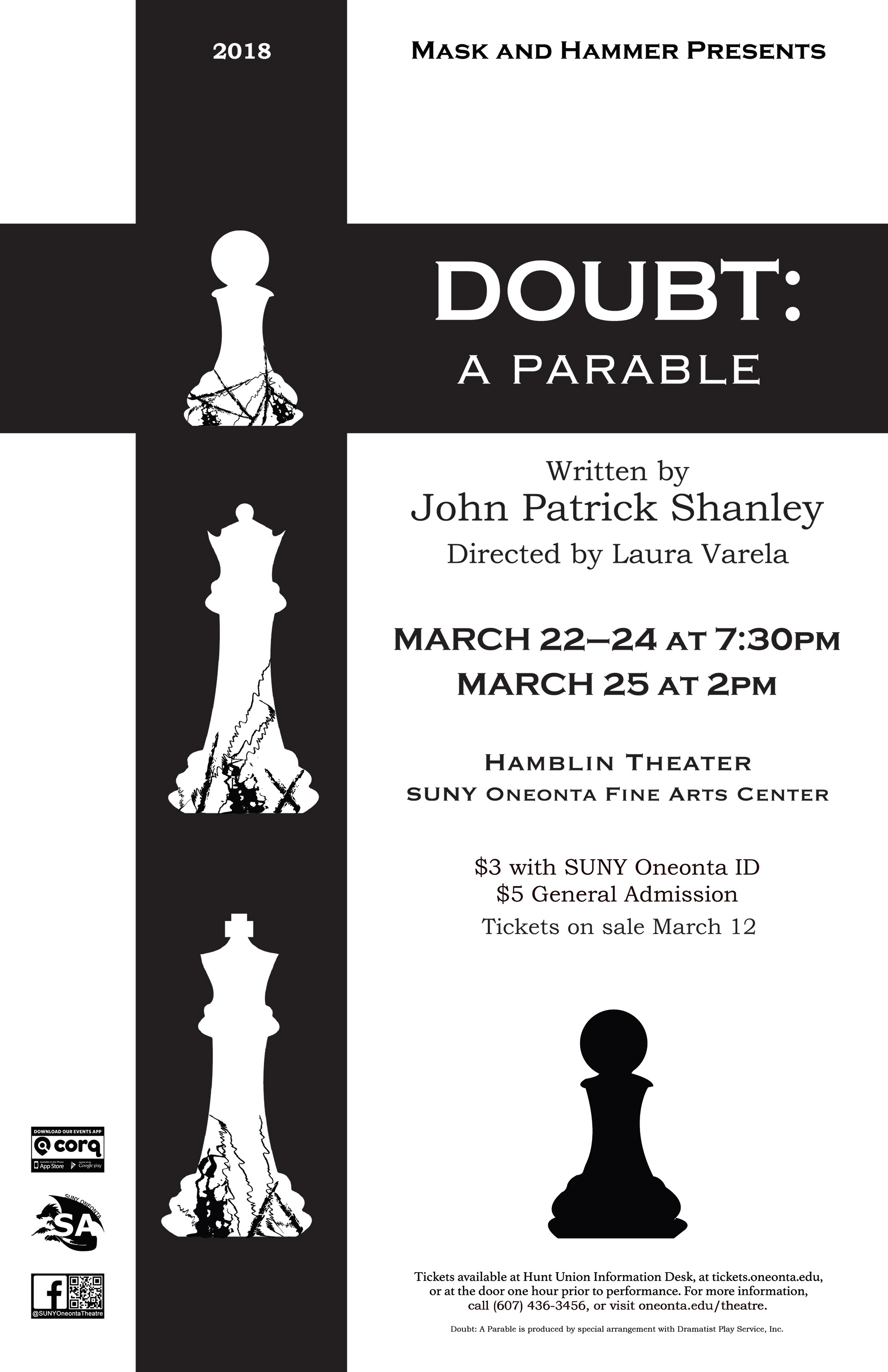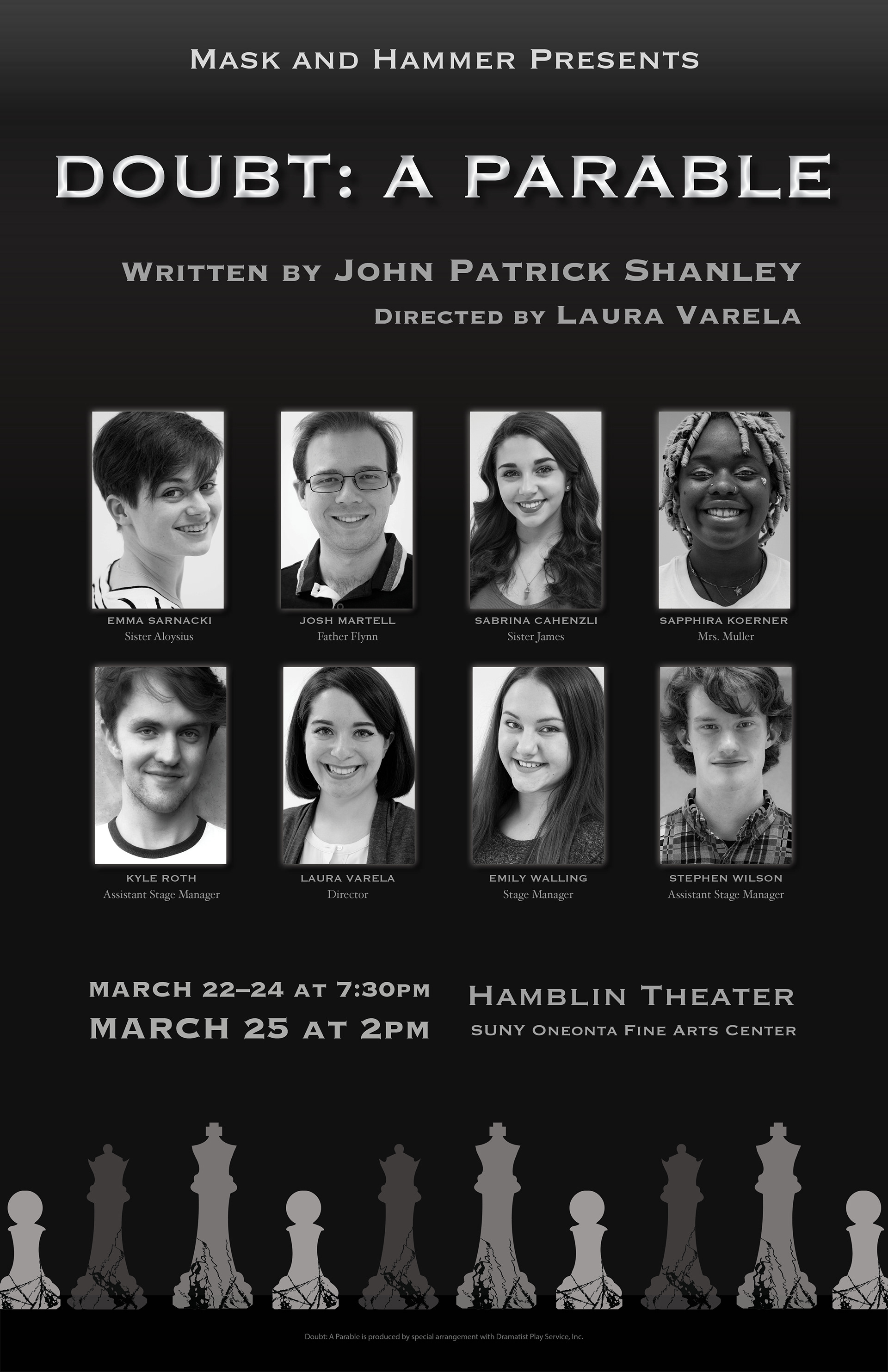 General theatre poster and headshot poster for Doubt: A Parable. Written by John Patrick Shanley and directed by Laura Varela.